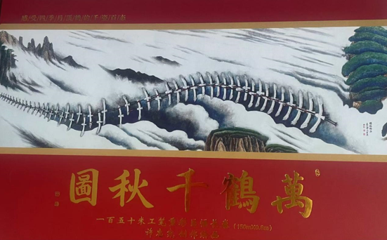 许先生画作存稿颇丰,《万鹤千秋图》系倾心之作,从1990年开始动笔,到2023年完稿,创作时间长达32年。图长150米,宽0.8米,由100幅单图构成一幅整图,所画丹顶鹤万余只。打开画卷,每页单看就是一幅丹顶鹤图,随着册页缓缓打开,构成长卷一幅。画卷以春夏秋冬为轴线,巧妙描绘出不同季节丹顶鹤的情态。作者通过一幅又一幅的画图,引导观赏者体验大自然的奇妙,感受国鸟的安静祥和,陶醉于优美环境的舒畅,达到人与自然和谐相生的审美情趣。