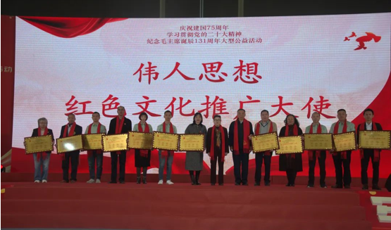 本报讯 (《作家报》记者李法明 特约记者张伟锋 通讯员刘小军 粟文莉报道)在历史长河的关键坐标上,2024 年 12 月 22 日这一天熠熠生辉,一场意义深远的大型公益活动在广州黄埔·知识城国际会展中心隆重举行,犹如一颗璀璨星辰照亮了红色文化传承的道路。此次活动由中国红色文化研究会、中国毛泽东思想研究会等具有深厚文化底蕴和影响力的权威机构强强联手主办,在中国拥军大使网的精心总策划下,更得到了广东海吉斯水务科技有限公司、梁家璟裕(广东)文化传播有限公司、惠州农夫科技有限公司等众多有识之士和爱心企业的慷慨赞助与全力支持,共同为纪念毛主席诞辰 131 周年、庆祝建国 75 周年以及深入学习贯彻党的二十大精神,搭建起一座精神的桥梁,吸引了社会各界广泛的关注与参与,成为了红色文化传承征程中的一座重要里程碑。
