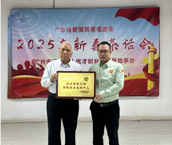 此前,张伟峰副会长还受邀参加了广东省爱国拥军促进会 2025 年新春茶话会。此次茶话会由广东省爱国拥军促进会主办、副会长蒋银新所属广州市退役军人优才创业孵化基地承办,于 2025 年 1 月 2 日上午在广州市海珠区琶洲街道红船港创意园新港东路悦茶悦酒餐厅二楼大厅盛大举行。原济南军区空军司令员刘忠兴将军和中国扶贫基金会副会长、广东省老区建设促进会理事会会长暨广州市原政协主席陈开枝同志亲临茶话会,为张伟峰颁发了《爱国拥军工作贡献突出先进个人》荣誉牌匾,现场气氛热烈庄重,充分彰显了社会各界对爱国拥军工作的重视与支持。