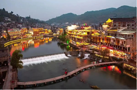 湘西凤凰,以其特有的典雅恬静,妩媚婉约而魅力四射,同时也因沈从文故居享誉华夏,历来深受国内外游客青睐,我也早有耳闻且心驰神往。十余年前一秋日,受特邀赴赣参加萍乡文氏五修族谱发行仪式结束后,于当日下午匆匆登上开往湘西的列车,沿湘赣边界南下,途径株洲,长沙,湘潭转湘西怀化,然后乘汽车直达久仰之地凤凰。夜幕降临,华灯初上,沱江两岸金碧辉煌。首先映入眼帘的是,立在岸边的一排吊脚楼,显得古老而挺拔。以前只听说过“吊脚楼”这个名称,而始终没见过,现在才目睹她的模样。灯光下,隐约见乌蓬船在平静的江面缓缓驶过。夜市人流熙来攘往,厅堂店铺应接不暇,休闲娱乐格外欢畅……由挚友引领自上游顺江畔而下,一览凤城段沱江夜色——凤凰最佳境界,令人叹为观止!谨此小诗,意犹未尽……