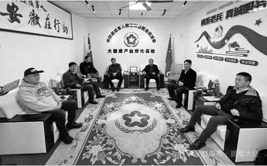 本报讯(《作家报》记者李法明 李淑刚 特约通讯员徐成杰报道)时值初冬,暖意融融。2025年11月25日下午,安徽省爱国拥军促进会会长、厅原任二级巡视员蔡元和,执行副会长兼秘书长、厅现任二级巡视员洪斌,监事长、厅原任二级巡视员王海礼,副秘书长储昭祥,财务负责人杨梅,携白求恩精神研究会检验医学分会副会长、研究员童劲松,全国职健行动推进委员会安徽办事处原副主任陈光等一行,怀着对退役军人事业的深切关怀,专程莅临中国退役军人就业创业服务促进会大健康产业孵化基地(以下简称“基地”)考察指导。中国拥军大使、基地负责人徐成杰及秘书处相关人员,军创全民健康餐车总经理李军等陪同考察。考察团通过实地走访、听取汇报、互动交流等方式,全面了解基地赋能退役军人就业创业、践行拥军爱民使命的实践成果,对其深耕细作的拥军举措与创新实践给予高度评价,为基地高质量发展注入强劲动力。