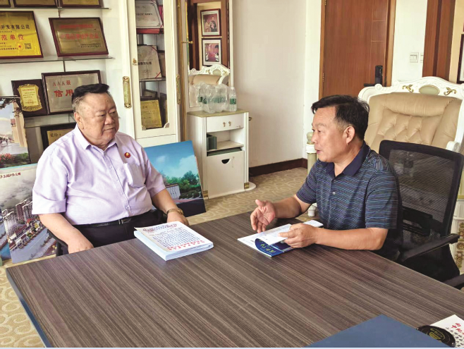 图为周庆戈同中国收藏家协会报刊分会副会长、没有共产党就没有新中国报纸展览百馆工程知道委员会主任王希宏就红色文化展览馆提升改造和社会化运营等事宜进行深入交流。