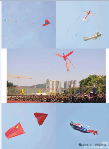 首先展示的是空中科技,有飞舞的凤凰,有英俊的超人,还有一架纸飞机拖着鲜红的五星红旗在空中飘扬。接着,退伍军人们表演了在战场上的场景,他们威风的军姿、精准的作战手语,震撼极了。最后,轮到同学们表演了:有幼儿园大班的弟弟妹妹们表演篮球操,有高年级的同学表演国防战术,还有我们全校学生表演武术操.